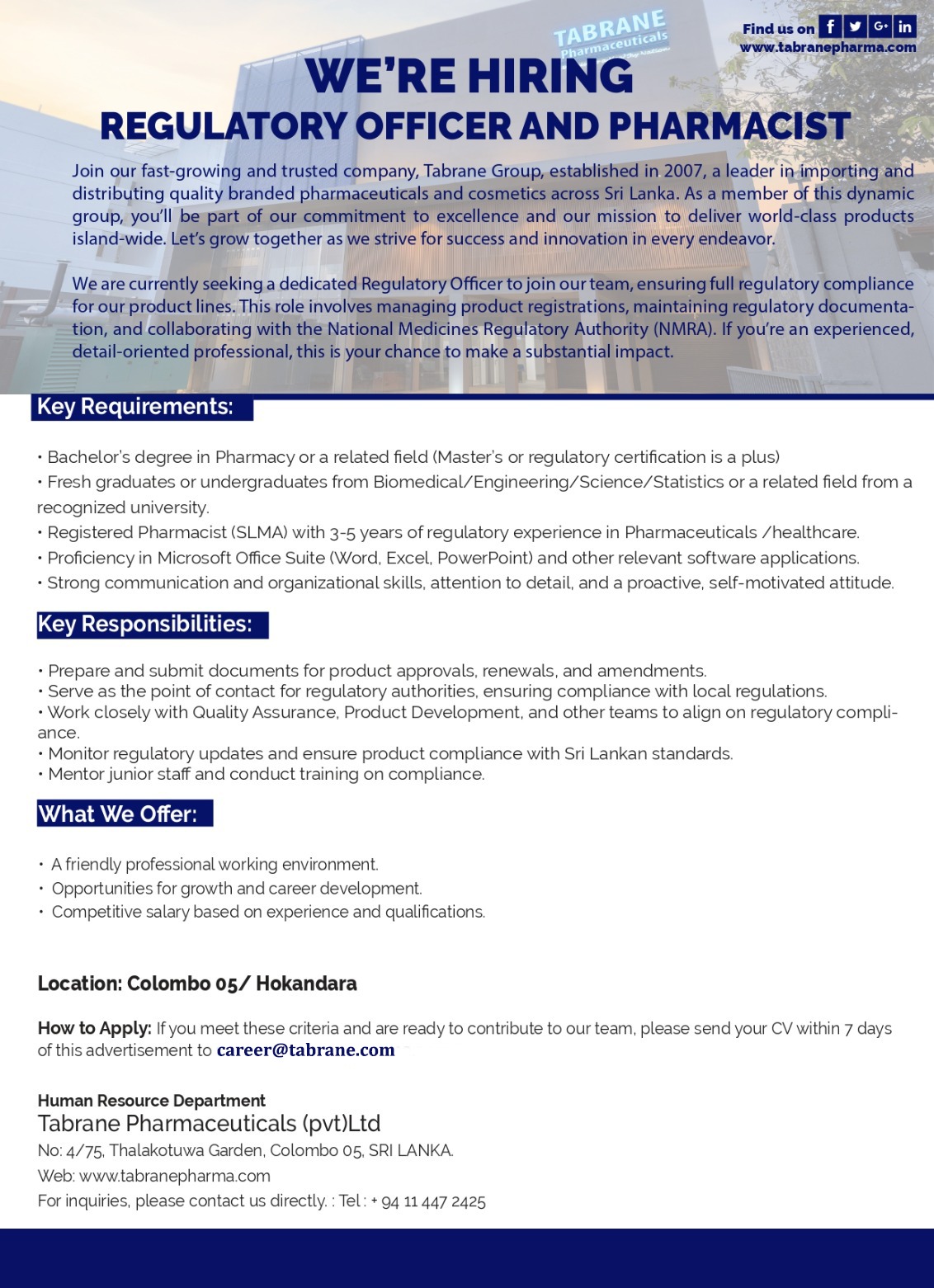 The selected professionals will ensure regulatory requirements are met, support product approvals & maintain high standards of quality and compliance across operations.